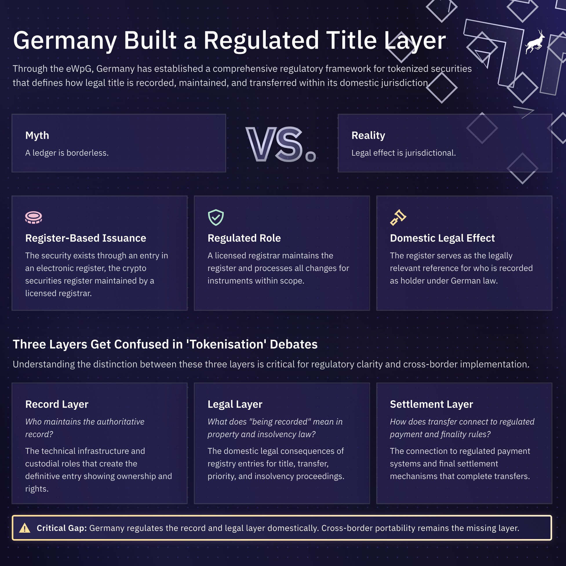 Germany's Electronic Securities Act (eWpG) answered a basic question: What happens when the paper certificate disappears? An electronic security exists through an entry in an electronic securities register. The holder is whoever that register names. Property law questions follow the law of the state supervising the registerkeeper. This creates domestic certainty. It also creates a border. A German register entry carries German legal effect, not automatic EU-wide recognition.